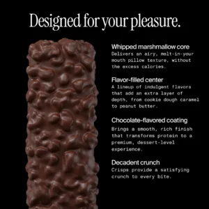 Fluffy, cookie dough flavored core, with notes of brown sugar, butter, and vanilla. Layered with caramel ganache and crisps. Dipped in chocolate flavored coating.