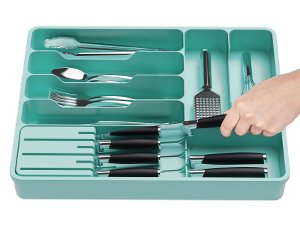 • Complete and Versatile: Cutlery drawer organiser for forks, spoons, and knives. The additional drawable sections are ideal for storing cooking utensils like spatulas, tongs, and ladles. These versatile organizers can be utilized in various rooms throughout your home. Use them to keep your office supplies in order on your desk, organize your makeup and toiletries in the bathroom, or tidy up arts and crafts supplies in your playroom. Securely stores multiple knives for effective space saving!