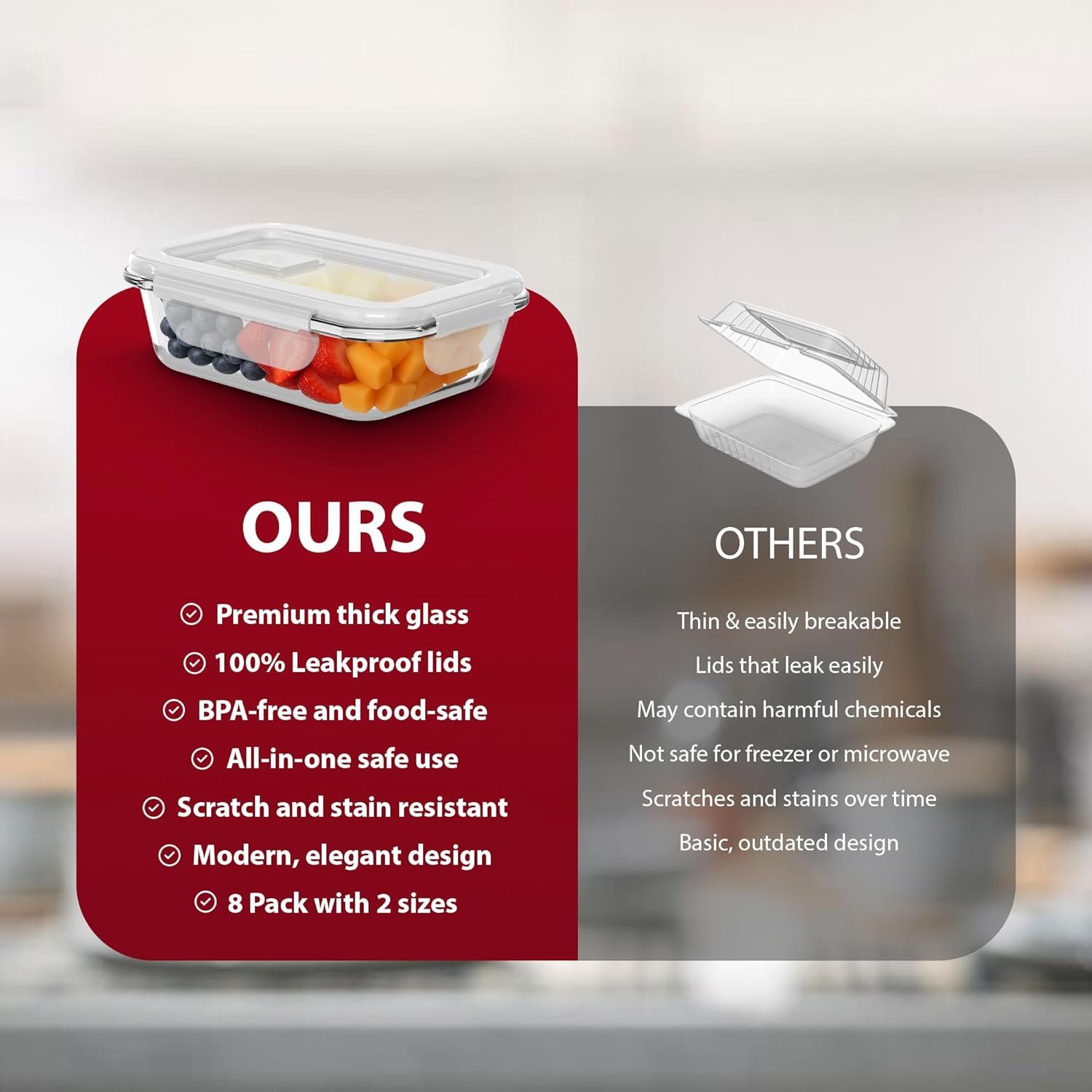 • PERFECT VARIETY OF SIZES FOR ANY MEAL – This 8 pack includes four 1050ml and four 370ml glass food containers with lids, giving you the flexibility to store large portions, small snacks, sauces, or leftovers with ease. Whether meal prepping or packing lunches, you’ll always have the right size ready.